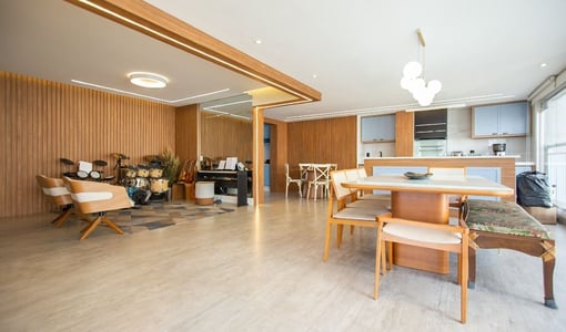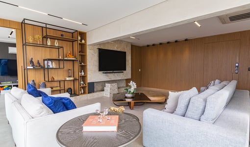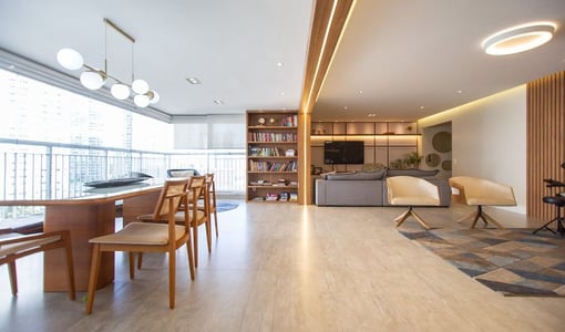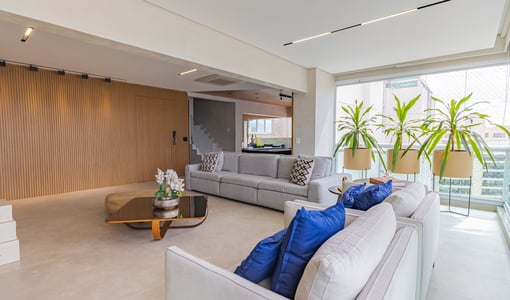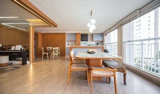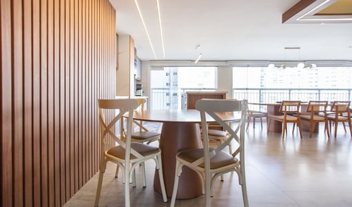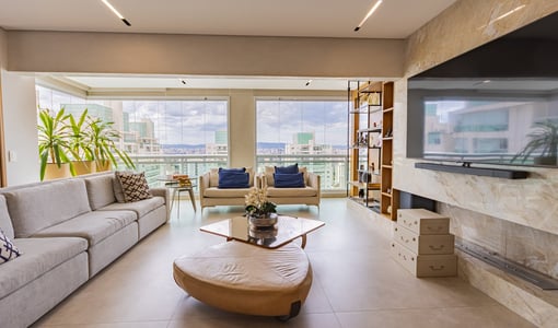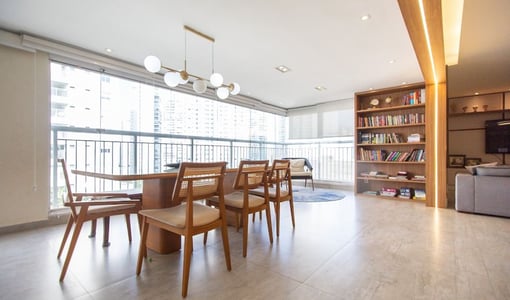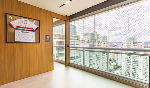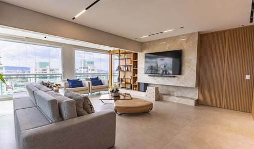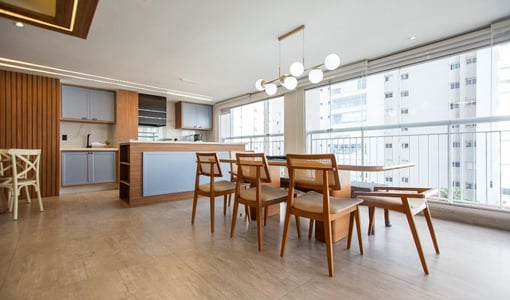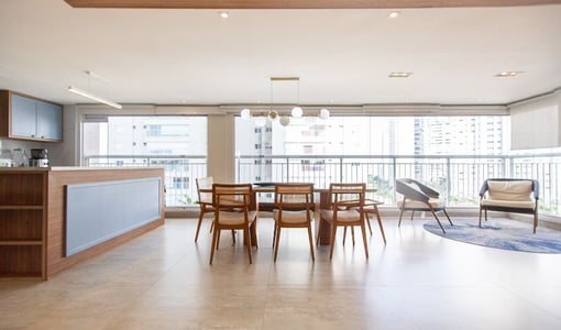 O living integrado à sacada gourmet amplia a percepção de espaço e é ideal para recepções. A varanda com churrasqueira e vista livre proporciona um ambiente de lazer privativo com boa iluminação e ventilação natural.